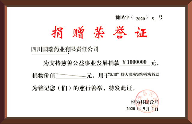 2020年8月18日,四川省犍为县遭遇百年未遇特大洪涝灾害,乐竞体育·乐竞网站登录官网入口-乐竞(中国)集团国瑞药业向犍为县灾区捐赠现金100万元。